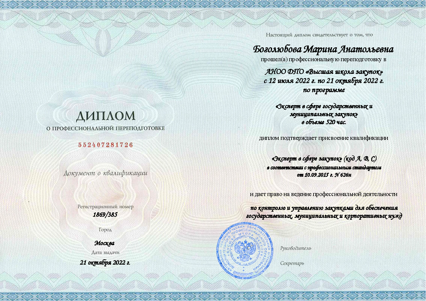 После успешного окончания курса вы получаете диплом, дающий право работать контрактным управляющим. Это официальная квалификация "Эксперт" для профессиональной деятельности в сфере закупок для государственных и муниципальных заказчиков.